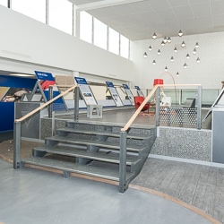 Le cœur du show-room se présente comme un espace d’exposition organisé en trois zones distinctes : habitat, aménagement urbain et grands projets. Le design béton est aussi omniprésent sur ces espaces. Le visiteur peut ainsi voir le béton, le toucher, voir les applications et utilisations possibles et comprendre les systèmes constructifs. Depuis la plate-forme d’exposition, on bénéficie également d’une vue plongeante sur les salles de fabrication d’échantillons et d’essais sur les bétons.