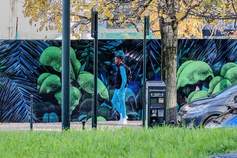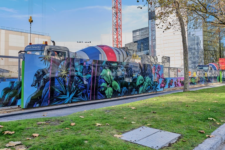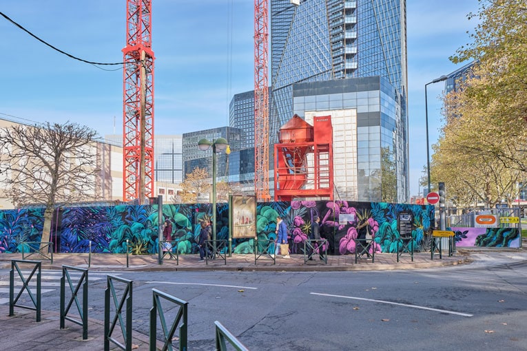 Grâce à une fresque au décor végétal signée Julien Colombier produite par Quai 36, Bouygues Bâtiment Ile-de-France et Nexity transforment poétiquement la palissade du chantier de la résidence Lilo, à Puteaux.