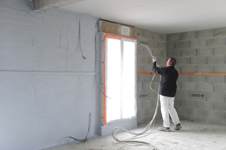 Weber.mur int’air de Weber est la solution idéale pour l’étanchéité intérieure à l’air des murs et des jonctions. Ce revêtement, à base de gypse et de chaux aérienne, se projette mécaniquement sur les murs intérieurs en deux passes “frais sur frais” pour une épaisseur totale de 5 mm. Cette solution permet de traiter , en une seule intervention, non seulement l’étanchéité des murs, mais aussi les ponts thermiques avec les jonctions murs/plafonds/planchers/menuiseries, avant la mise en œuvre du doublage, grâce à son excellente adhérence aux supports. Web.mur int’air permet aux façadiers de sécuriser rapidement et durablement les fuites d’air d’un bâtiment, afin d’atteindre les performances dictées par la RT 2012. Applicable sur la totalité du mur (avant la pose du doublage et après celle de l’enduit), il offre une parfaite compatibilité avec l’isolant et les colles destinées aux doublages à base de plâtre. Sa mise en œuvre est rapide (4 h à deux pour 100 m2) et associée à un délai de recouvrement de seulement 48 h (notamment dû à l’absence de ciment).